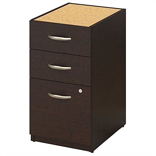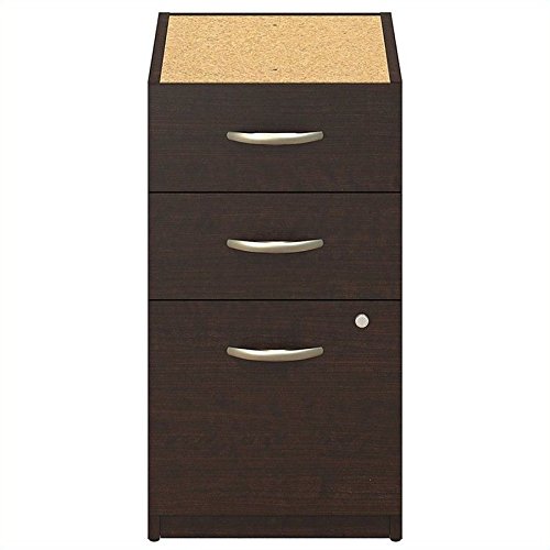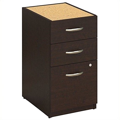 Customize your office with the Series C Elite 16W 3 drawer pedestal in Mocha Cherry. Enjoy the classic styling and clean lines of this convenient storage solution. Organize office supplies with top two box drawers while file drawer below conveniently accommodates letter, legal and A4 size files. Drawers glide smoothly on durable full-extension ball-bearing slides for years of trouble free use. This Series C Elite 3 drawer pedestal easily integrates with your preferred desking option for a cohesive style, so you can create the personalized workspace you've always wanted. Front lock offers an interchangeable core that secures Bottom two drawers. Pedestal is constructed of thermally fused laminate for superior resistance to scratches and stains accented by a beautiful rich finish and brushed nickel finish drawer pulls. This solid, Proven family of products fits all of your home or professional office needs regardless of space, future expansions and budgets. It works well in any setting from a small private or home office to large collaborative corporate settings. Meets ANSI/BIFMA standards for safety and performance. Backed by Bush Business Furniture 10 year warranty. American made with U.S. And imported parts.Professional Construction delivers strength and durability2 box drawers hold supplies and utilize 3/4 extension ball-bearing slides for smooth operation