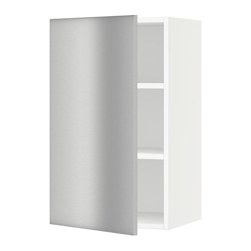 Product description Door: Fiberboard, Acrylic paint, Polyester paint Wall cabinet frame: Frame: Particleboard, Melamine foil, Polypropylene Back: Fiberboard, Acrylic paint Hinge: Steel, Nickel plated Shelf: Particleboard, Melamine foil, Polypropylene Door damper for hinge: Main parts: Steel Plastic parts: PolyamideThe door can be mounted to open to the left or right. You can customize spacing as needed, because the shelves are adjustable. The door damper prevents your cabinet door from slamming by catching the moving door so that it closes slowly, gently and silently. Snap-on hinges can be mounted onto the door without screws, and you can easily remove the door for cleaning. Sturdy frame construction, ¾" thick.Good to know Different wall materials require different types of fasteners. Use fasteners suitable for the walls in your home. The hinge is adjustable in height, depth and width. Requires a knob or a handle Care instructions Wipe clean with a damp cloth. Use only water or a non-abrasive detergent. Wipe dry with a clean cloth.