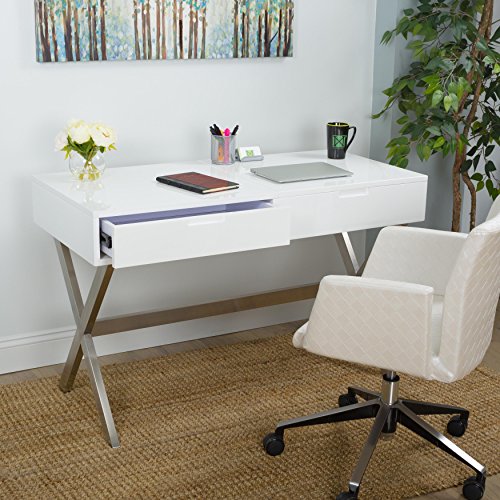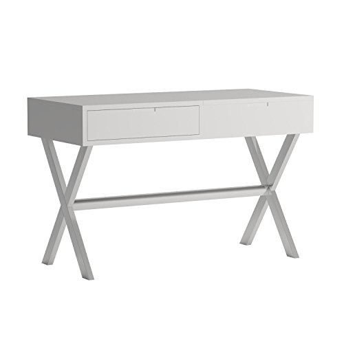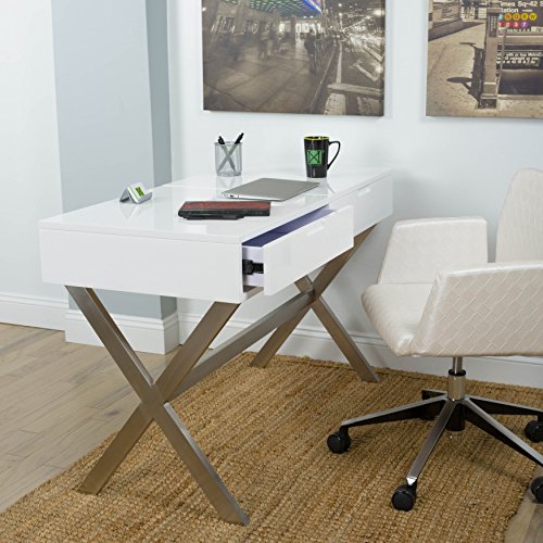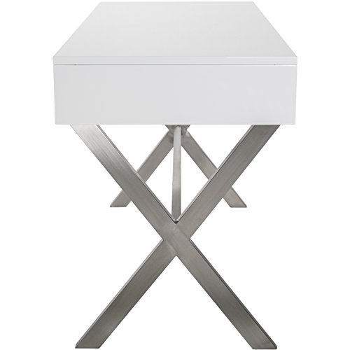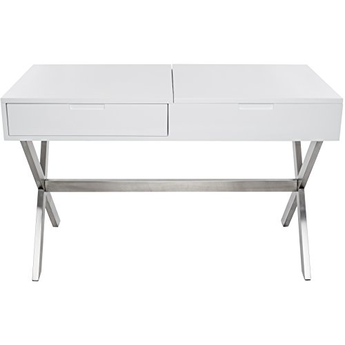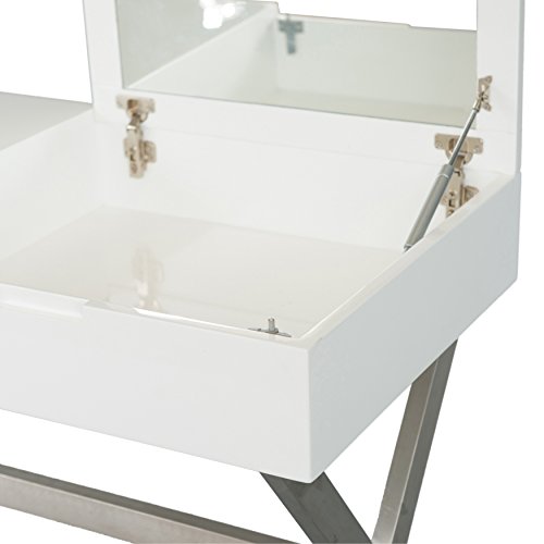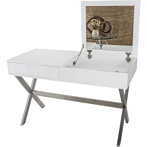 A little vanity goes a long way. Doubling as a chic work desk, lift up the hinged top to reveal a convenient mirror and room for all your fashionable accessories. The second hidden drawer is the perfect place to store your laptop or other home office essentialsA Beautiful Desk and Vanity in High Gloss White Lacquer FinishIn Brushed Stainless Steel Frame with one drawer available. The flip Top Opens to a Mirror and additional Storage Space